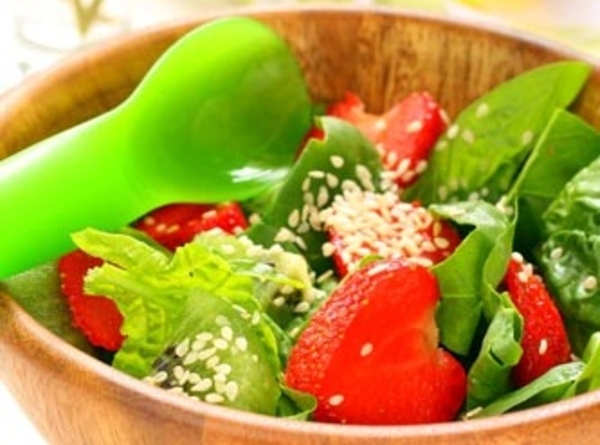 Клубнику и киви нарезать ломтиками, шпинат порвать руками. Перемешать, заправить оливковым маслом, добавить лимонный сок, посолить и поперчить. Посыпать салат кунжутом и подавать.