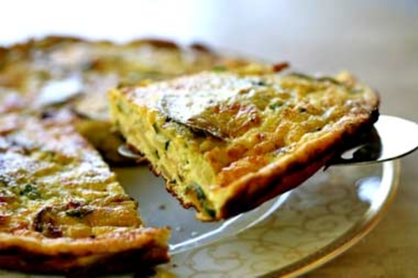 Разогреть оливковое масло в форме, подходящей для духовки, и жарить нарезанные кружочками кабачки около 5-6 минут до золотистого цвета. Снять с огня, убрать лишний жир и дать остыть в течение 30 секунд, затем добавить кусочки кабачков в яичную смесь.