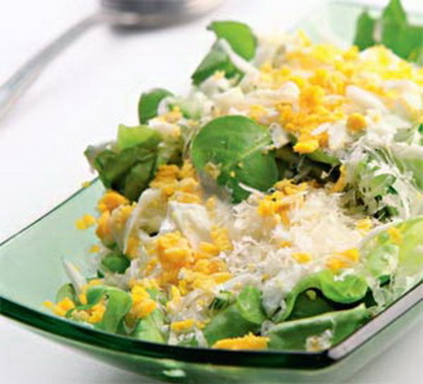 Выложить на салат йогурт, сверху посыпать сыром, затем яйцами. Не перемешивая, подать к столу.