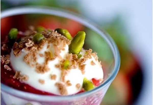 Выложить десерт в креманку слоями: крем, клубника, фисташки, шоколад. Затем повторить слои. Украсить шоколадом, фисташками и крошками печенья.
