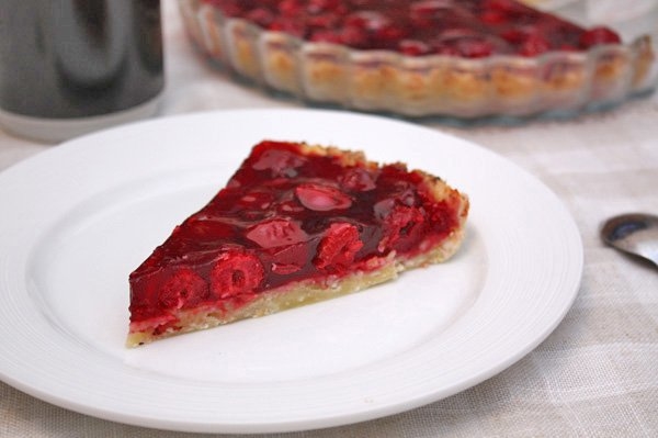 Когда вишневый сок начнет немного застывать, но будет еще жидким, его надо вылить на основу пирога и сразу же поставить на холод. Важно не выливать на пирог слишком теплый сок, чтобы он не пропитывал основу. Когда желе застынет, пирог можно резать и подавать.