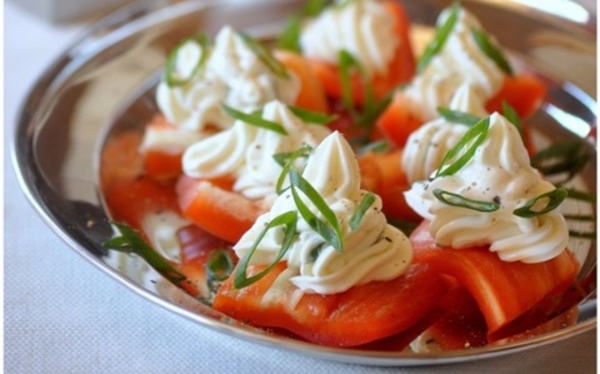 Зеленый лук порезать, часть смешать с сыром Филадельфия. С помощью кондиреского мешка выложить на подготовленные квадраты, посыпать черным перцем и оставшимся луком.