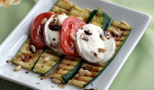 Смешать оливковое масло, бальзамический уксус и щепотку соли. На тарелку выложить цуккини, украсить сыром и помидорами. Полить заправкой и посыпать поджаренными орешками.
