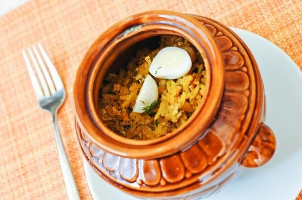 Отвариваем до готовности рис с шафраном. Обжариваем на масле нарезанный кубиками лук и чеснок до золотистого цвета.