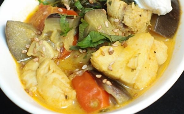 На небольшом огне поджарить лук, чеснок, имбирь, добавить карри и хорошо перемешать. Добавить баклажаны, помидоры, рыбу, 3 веточки кинзы, влить воду, посолить, поперчить и накрыть крышкой. Варить 20 минут.