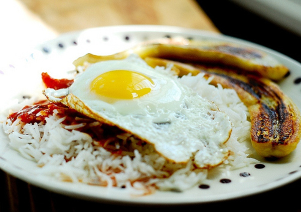 Выложить рис на тарелку, полить томатным соусом. По бокам выложить половинки бананов. Сверху аккуратно выложить яйцо и поперчить. Блюдо готово!