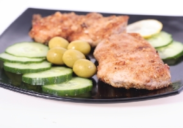 Мясо нарезать кусочками толщиной 1 см, посолить и поперчить по вкусу. Обвалять в панировочных сухарях и обжарить с двух сторон на разогретой сковороде в течение нескольких минут.