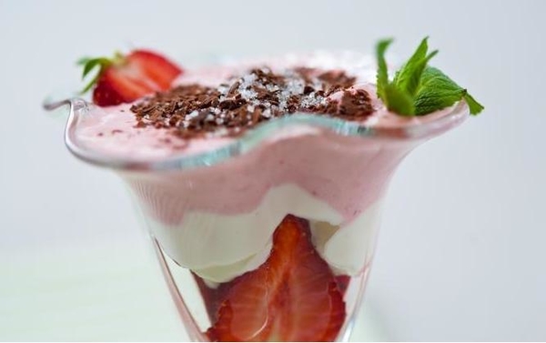 Для другого варианта десерта отправь в стакан кусочки клубники, добавь пару ложек сметаны, сверху залей клубничным смузи. Присыпь десерт любимым тертым шоколадом (можно добавить еще немного сахара), укрась клубникой и мятой.
