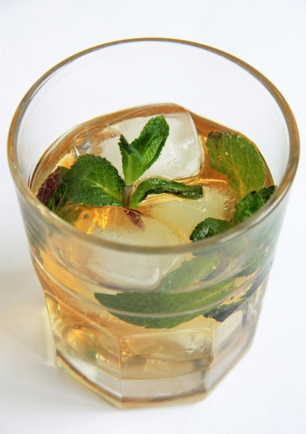 В охлажденный стакан бросить листики мяты, влить сахарный сироп и с помощью мадлера легонько растереть мяту с сиропом.
