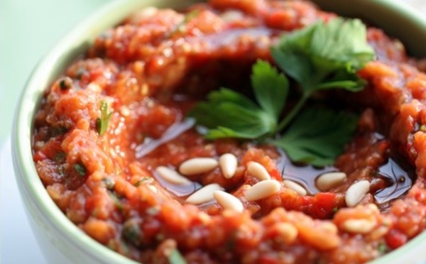 Сложить в блендер баклажан, перец и взбить так, чтобы оставались кусочки овощей. Переложить массу в глубокую тарелку, добавить лук со сковороды, петрушку, каперсы, томатную пасту, лимонный сок, уксус, орехи и хорошо перемешать. При необходимости посолить и поперчить. Подавать с хлебом.
