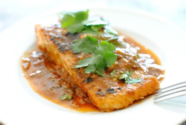 Теперь добавляем филе лосося, уменьшаем огонь, накрываем крышкой и тушим около 6 минут. Сверху посыпаем мелко нарезанной кинзой и подаем.