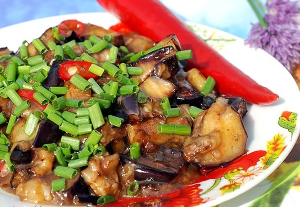 В чашке смешать ингредиенты для соуса. В другой чашке смешать чеснок, имбирь, чили, слегка обжарить, залить соусом, добавить обжаренные баклажаны, перемешать. Готовить еще 1-2 минуты и подавать.