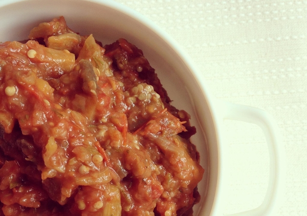 К луку и перцу добавляем помидоры, перемешиваем и готовим на слабом огне еще 10 минут. Добавляем мякоть баклажанов, перемешиваем и тушим, периодически помешивая до тех пор, пока не испарится вся лишняя жидкость (около 20 минут).
