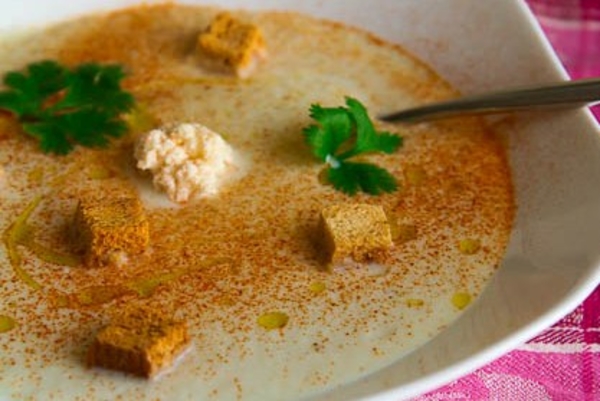 После закипания убавить огонь и варить цветную капусту около 20 минут – соцветия сварятся, но сохранят некоторую упругость. Самое время снять кастрюлю с огня и хорошо взбить блендером, после чего желательно протереть суп через сито, чтобы он обрел ту самую шелковистую текстуру. Вернуть суп в кастрюлю, добавить сливки и, помешивая, довести до кипения.