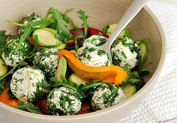Приготовить шарики из сыра. В отдельной емкости размять брынзу вилкой, добавить творог, перемешать. Скатать из сыра шарики и обвалять их в зелени.