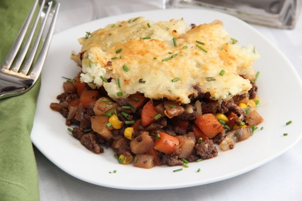 Добавить кукурузу и выложить смесь в форму. Сверху выложить пюре из картофеля и капусты и посыпать тертым сыром. Запекать 5-7 минут в духовке, пока сыр не расплавится. Приятного аппетита!