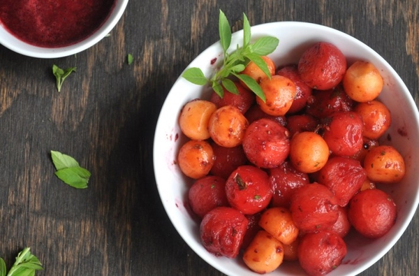 Очистить дыню и арбуз от семечек и с помощью ложки для мороженого нарезать их мякоть шариками.