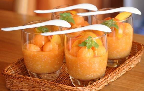 Разложить в бокалы (или креманки) готовое пюре. Из оставшейся дыни вырезать шарики и выложить сверху. Нектарин нарезать дольками и добавить к дыне, украсить листиками мяты.