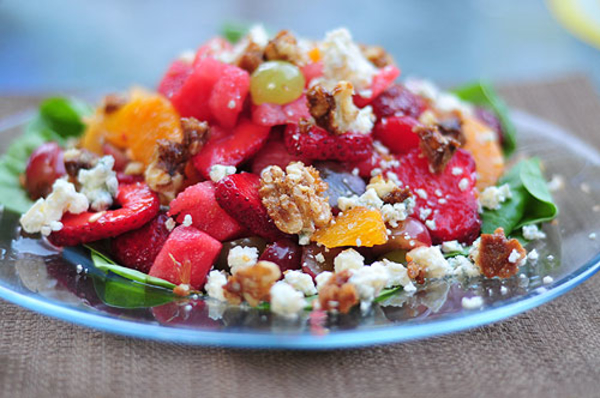 Арбуз, апельсины и виноград положить на подушку зеленого салата. Залить заправкой из упаренного уксуса. Сверху украсить голубым сыром и глазированными грецкими орехами.