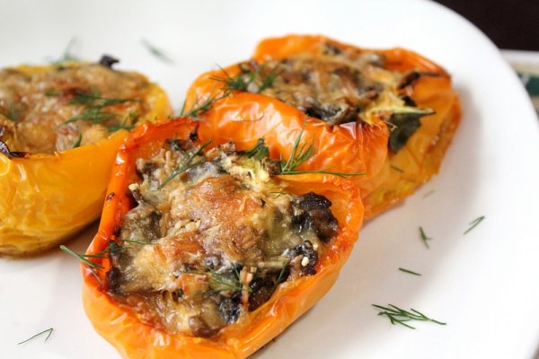 5. Начинить перец грибной массой, посыпать тертым пармезаном и запекать в разогретой до 180 градусов духовке 15-20 минут.