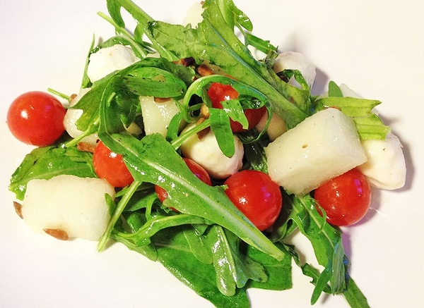 Для заправки смешиваем мед, оливковое масло, лимон, соль, перец. В салатнице смешиваем измельченные листья рукколы, добавляем кусочки дыни, помидоры, моцареллу, орешки. Заливаем все заправкой и подаем к столу.