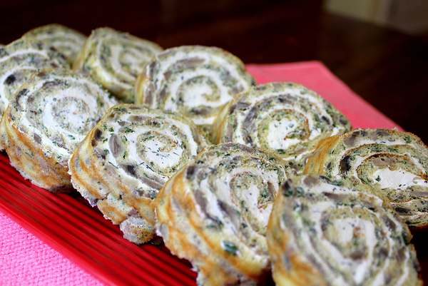 Противень застелить бумагой для выпечки. Выложить на нее грибную массу слоем 0.7 см и разровнять. Выпекать 15-20 минут при 180 С, затем смазать сливочным сыром, свернуть рулетом и нарезать порционными ломтиками.