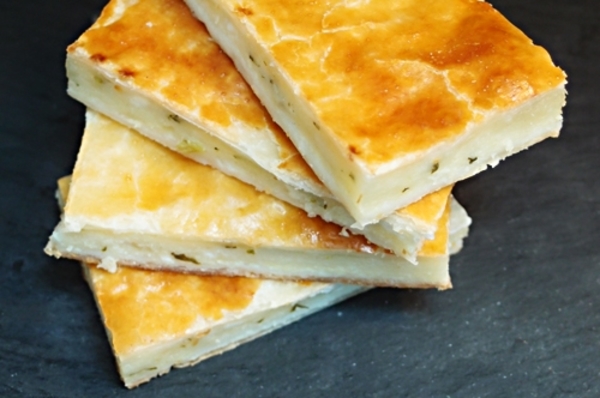 Выложить на противень первый рулон слоеного теста, аккуратно и равномерно выложить на него сырную массу, накрыть вторым слоем и как следует закрепить бортики.