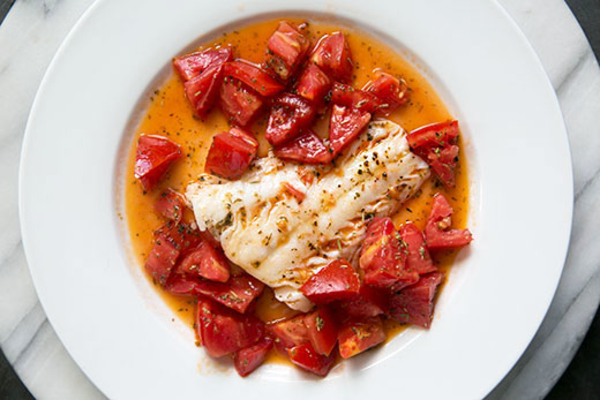 Разложить филе на тарелки. Посыпать помидоры черным перцем и хорошо перемешать. Полить филе томатным соусом и подавать с хрустящим хлебом и сухим вином.