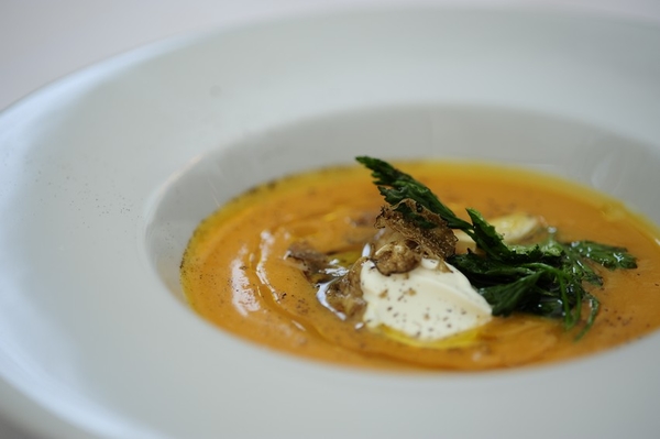 Наливаем в кастрюлю бульон. Добавляем кусочки тыквы, лук и отвариваем до готовности. Готовые овощи взбиваем с помощью блендера в пюре. Добавляем к грибам тыквенное пюре и крем из сливок и пармезана. Перчим и сбрызгиваем суп оливковым маслом