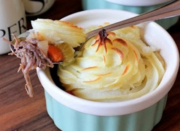 Включаем духовку и разогреваем до 220 градусов. Достаем ребра из сотейника. Разминаем мясо вилкой. Смешиваем с овощами. Выкладываем пюре с чесноком в кондитерский мешок с наконечником-звездочкой. В формы для запекания кладем мясо с овощами, сверху выдавливаем картофельное пюре.