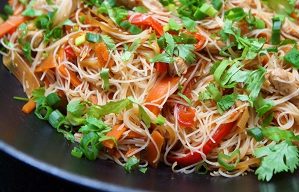 Нарезать курицу продолговатыми ломтиками и добавить в вок. Замочить рисовую вермишель в кипятке и оставить на 5 минут. Добавить курицу и лапшу в вок.