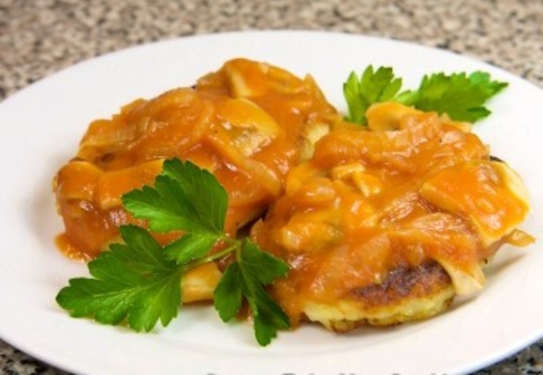 Заливаем томатным соусом грибы и лук, перемешиваем. Ставим кастрюлю на слабый огонь и варим 10 минут, постоянно помешивая. Заливаем соусом картофельные котлеты и подаем к столу.