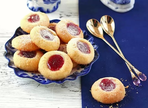 - Вынуть противень с печеньем из духовки, сделать повторные углубления. Положить по 1/4 ч л джема в углубление.