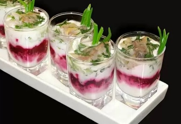 Веррин, как известно, это способ подачи закуски в стаканчиках, обычно предполагающий слои. Таким образом можно подать салат из свеклы и сельди с йогуртовой заправкой