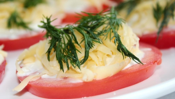Рецепт простой закуски из помидоров, тертого сыра, чеснока и майонеза