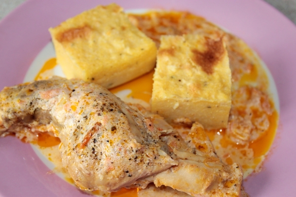 Выложить густую поленту в смазанную сливочным маслом форму 20 на 20 см и хорошо разровнять. Отправить в разогретую до 180 градусов духовку на 15 минут, чтобы полента подрумянилась. Остудить и нарезать порционными кусочками.