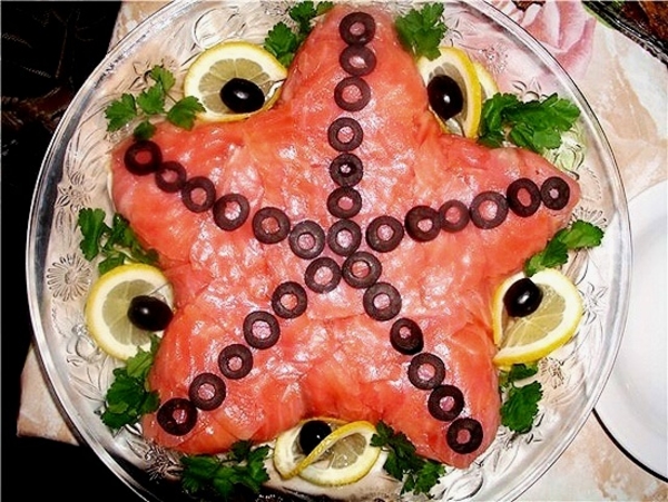 Поверх последнего слоя салата выложить полоски из красной рыбы, формируя морскую звезду.