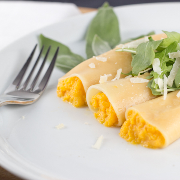 На дно формы для запекания налить часть соуса. Каннелони наполнить тыквенной начинкой и выложить в форму для запекания.