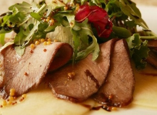 Хрустящие листья салата, сочная груша и нежное жаренное утиное филе, заправленное медово-горчичным соусом