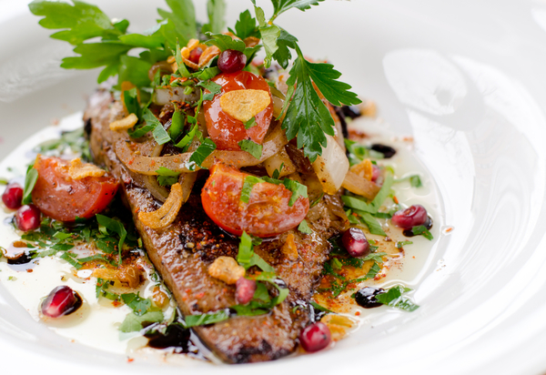 Влить смесь в сковороду, где жарилась печень, смешать с выделившимся при жарке соком и, помешивая, довести до кипения. Готовую печень выложить на блюдо, полить горячим гранатовым соусом. Украсить блюдо свежей зеленью и зернами граната.