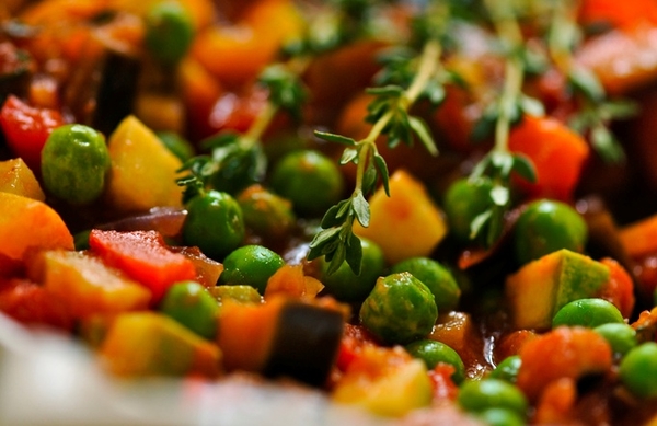 Зимний вариант рататуя: с консервированными томатами, цуккини и зеленым горошком