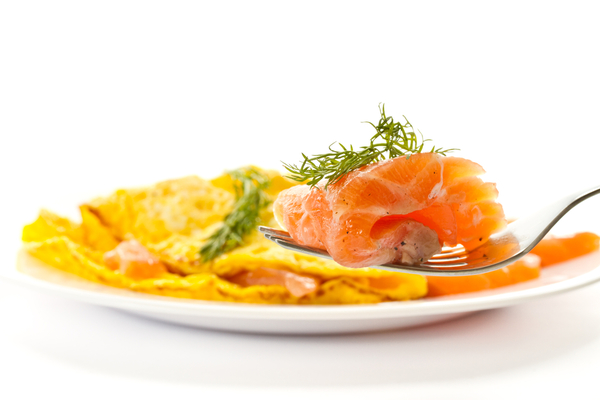 Когда омлет схватится, разложить сверху ломтики лосося на одну сторону и осторожно накрыть другой, сложив омлет пополам.