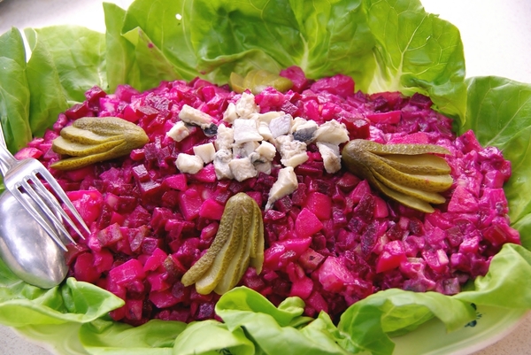 Рецепт зимнего салата из свеклы с картофелем, маринованными огурцами и сельдью