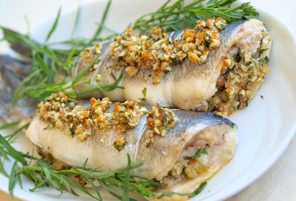 Сибас, фаршированный орехами и зеленью