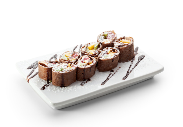Сладкие шоколадные блинчики с фруктовой начинкой можно подавать на завтрак или в качестве легкого десерта