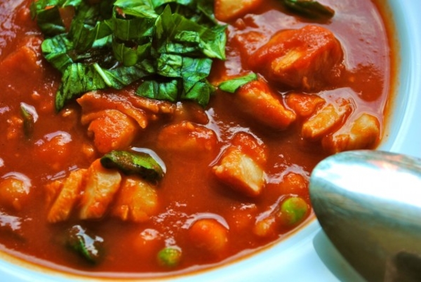 Рецепт острого зимнего супа с копченой треской, помидорами и чесноком