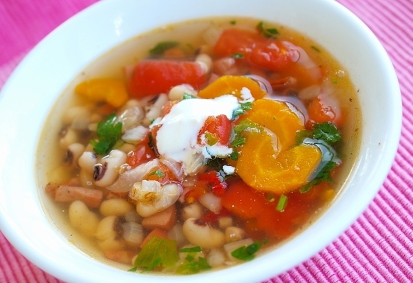 Помидор опустить на 30 секунд в кипящий бульон, достать шумовкой и снять кожицу. Нарезать мякоть помидора и положить в бульон. Сладкий перец очистить, мелко нарезать, добавить в суп.