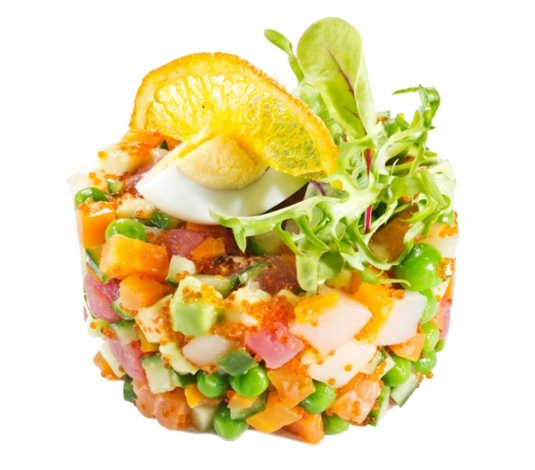 Привычный рецепт известного салата можно разнообразить, добавив него слабосоленого лосося, авокадо, свежие огурцы и замороженный зеленый горошек
