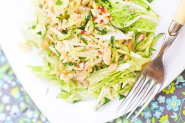 3. Петрушку и салат солим, перчим, поливаем заправкой и аккуратно перемешиваем. На тарелку выкладываем салат с петрушкой, сверху кладем яблоки и огурцы, немного перчим и по желанию поливаем любым растительным маслом, посыпаем орехами, кунжутом или цедрой лимона.