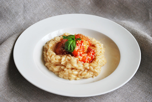 5. На теплые тарелки выкладываем ризотто, сверху креветки и соус со сковроды, пару листиков базилика и подаем к столу.